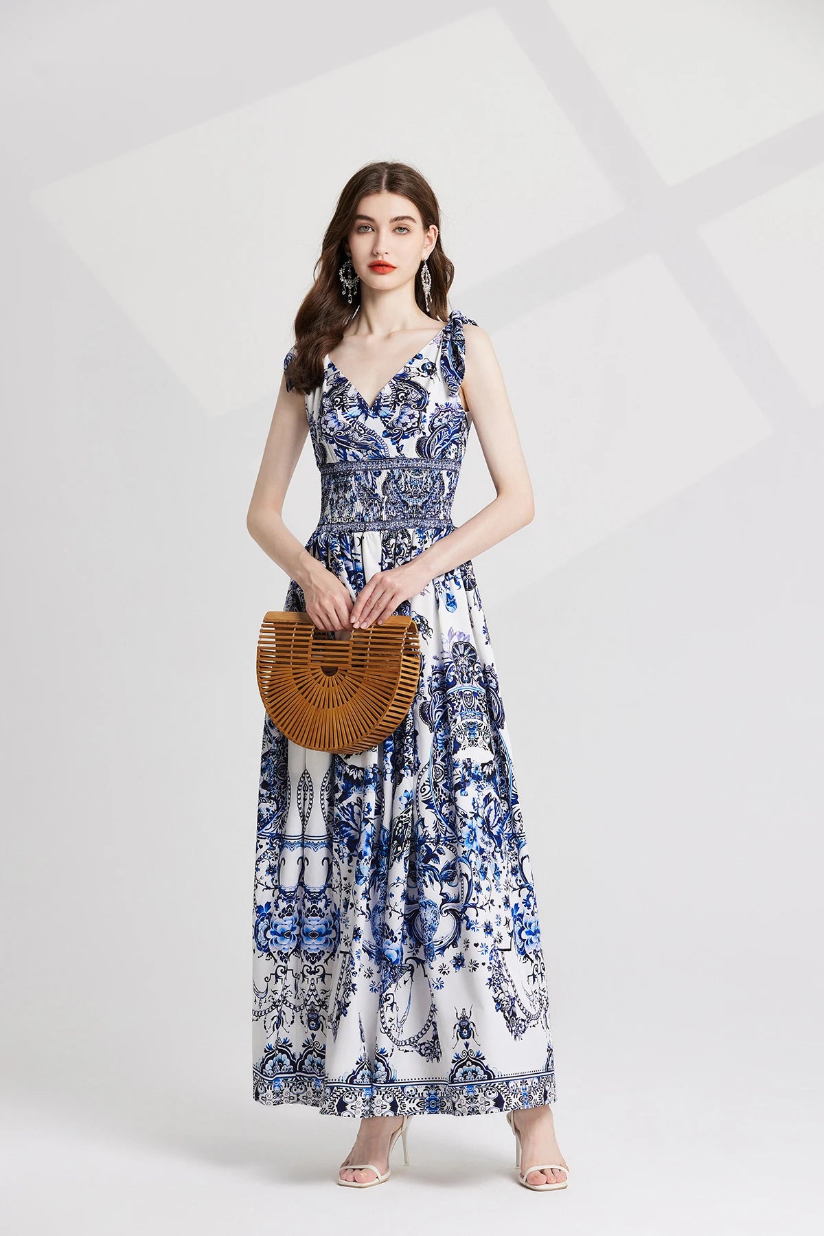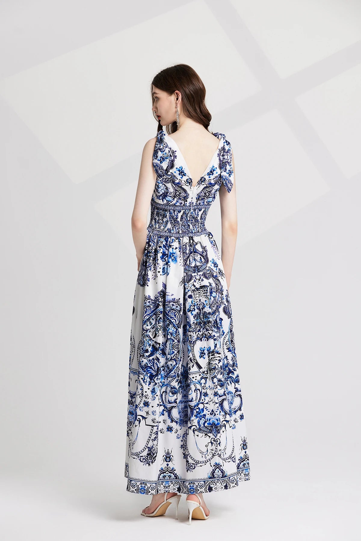 Chaque détail de cette robe a été pensé pour te mettre en valeur. Le motif bleu sur fond blanc est à la fois audacieux et subtil, créant un contraste visuel qui attire le regard. Le design est à la fois moderne et intemporel, te permettant de te démarquer tout en restant élégante.