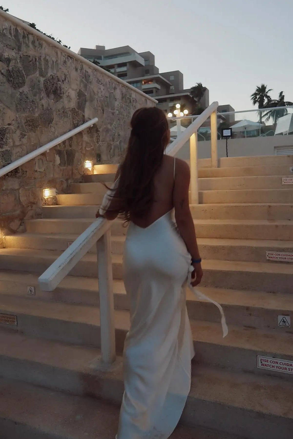 Quoi que tu fasses, où que tu sois, cette robe blanche en soie te fera briller comme jamais.