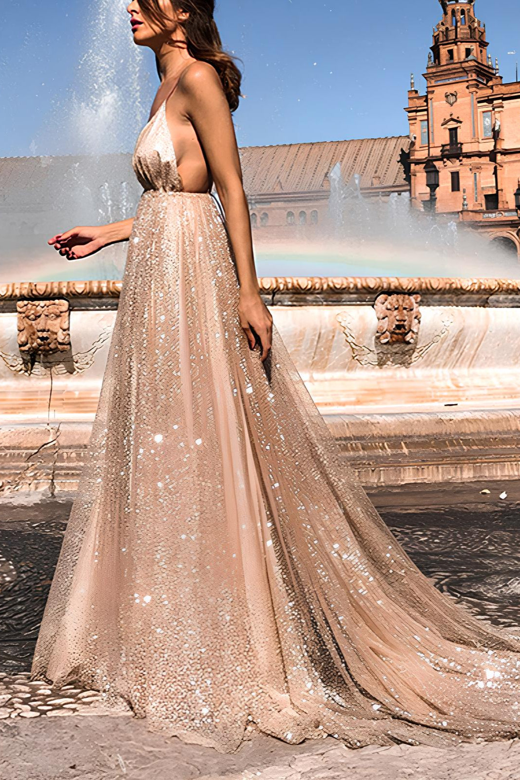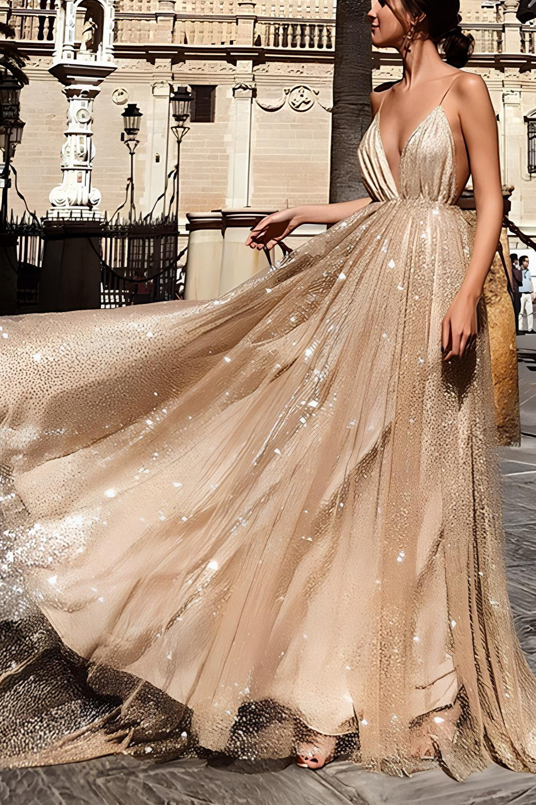Transforme-toi en une étoile scintillante avec notre Robe de soirée beige doré