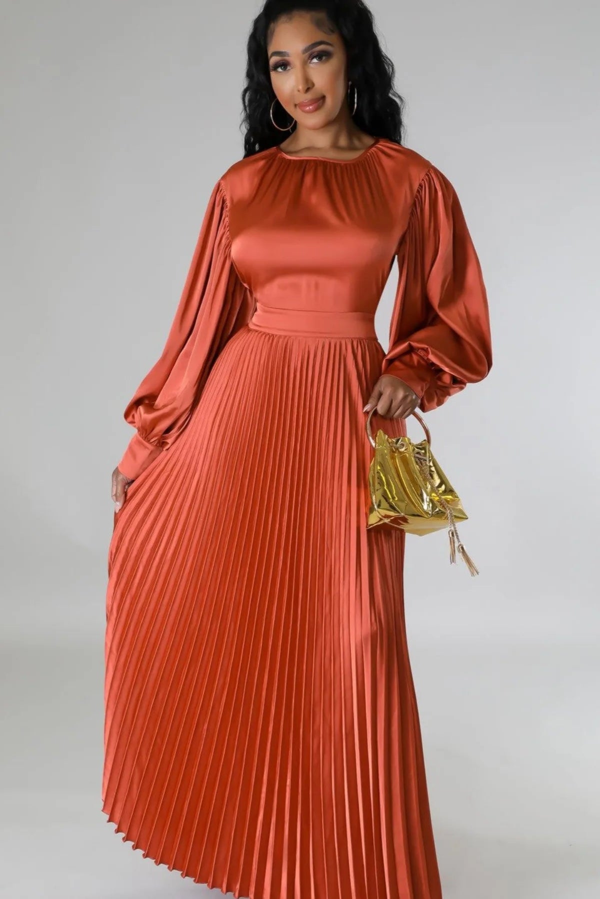 🔥 Fais sensation avec la Robe longue plissée terracotta, le must-have de la saison ! 🔥
